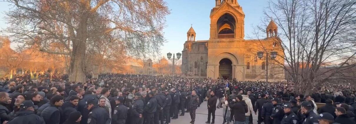 Yesterday, December 18, a tense and unusual situation unfolded at the Mother See of Holy Etchmiadzin. A group of bishops, whom many have described as having “betrayed God” (Arm. tiradav), arrived at the Mother See accompanied by an unprecedentedly large police presence and demanded the resignation of Catholicos of All Armenians Karekin II. Their demands, broadcast through loudspeakers, were drowned out by chants from believers who had also gathered on the premises.